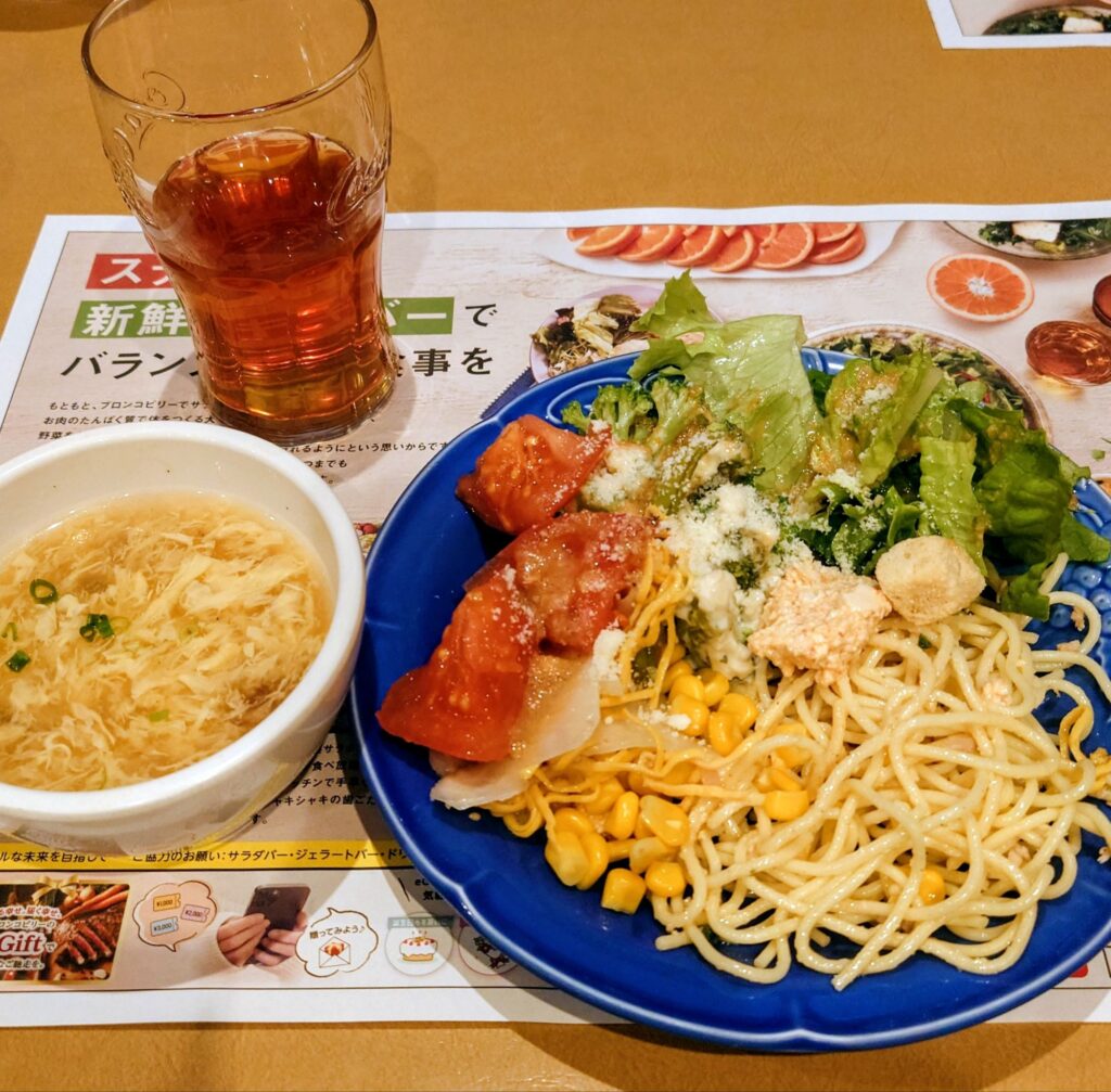 まずはサラダやスープ。ドリンクはルイボスティーにしました。